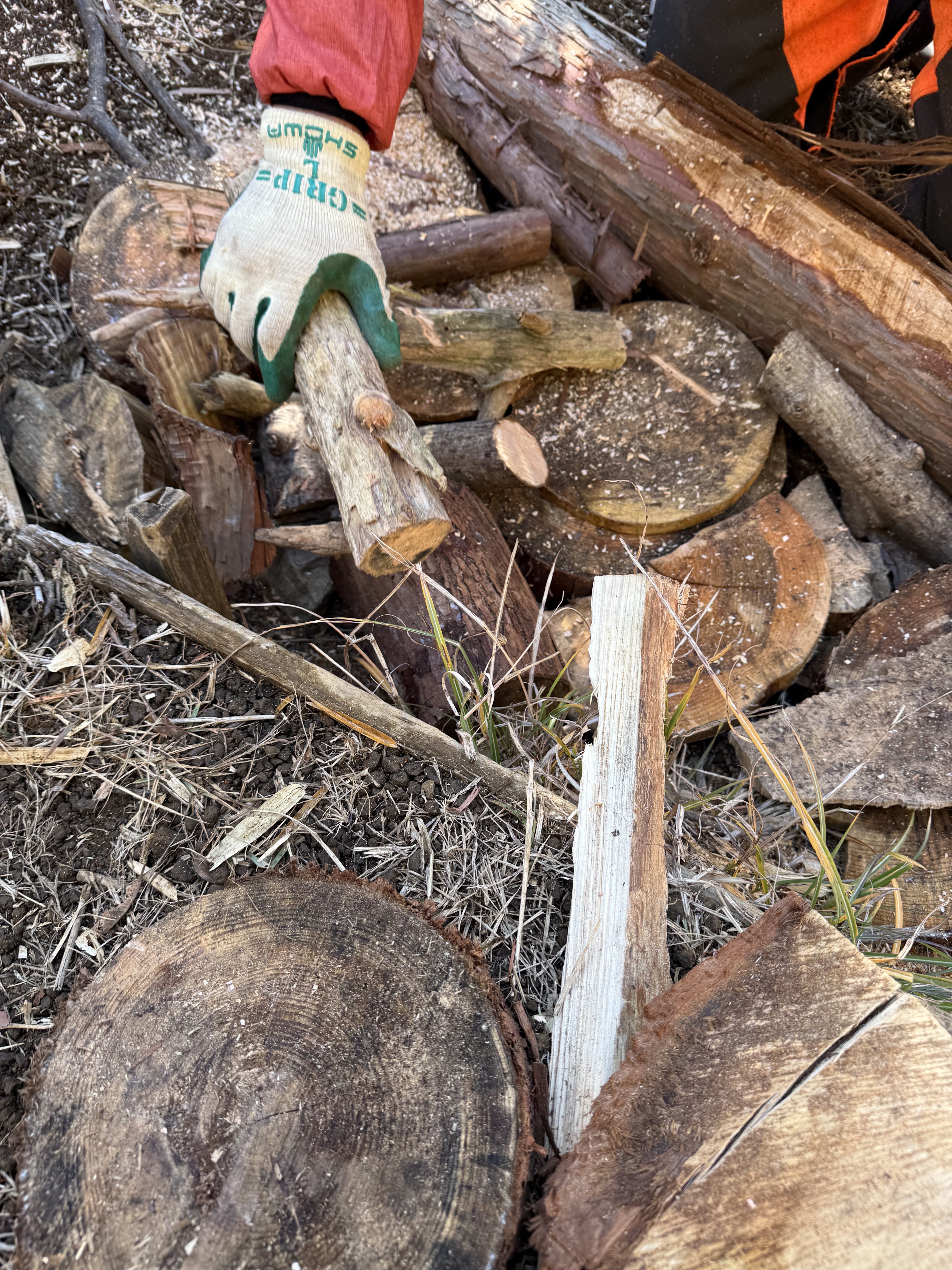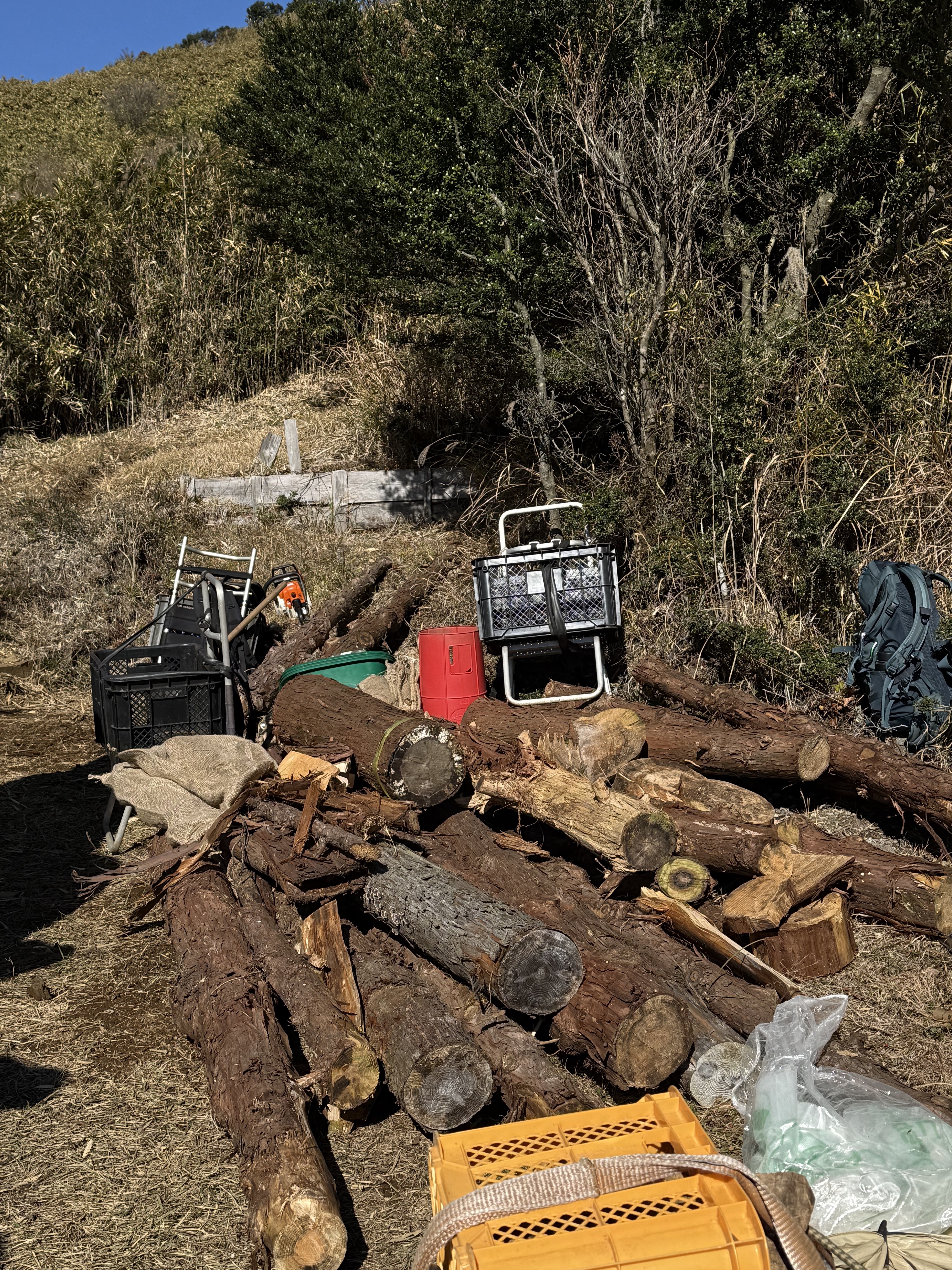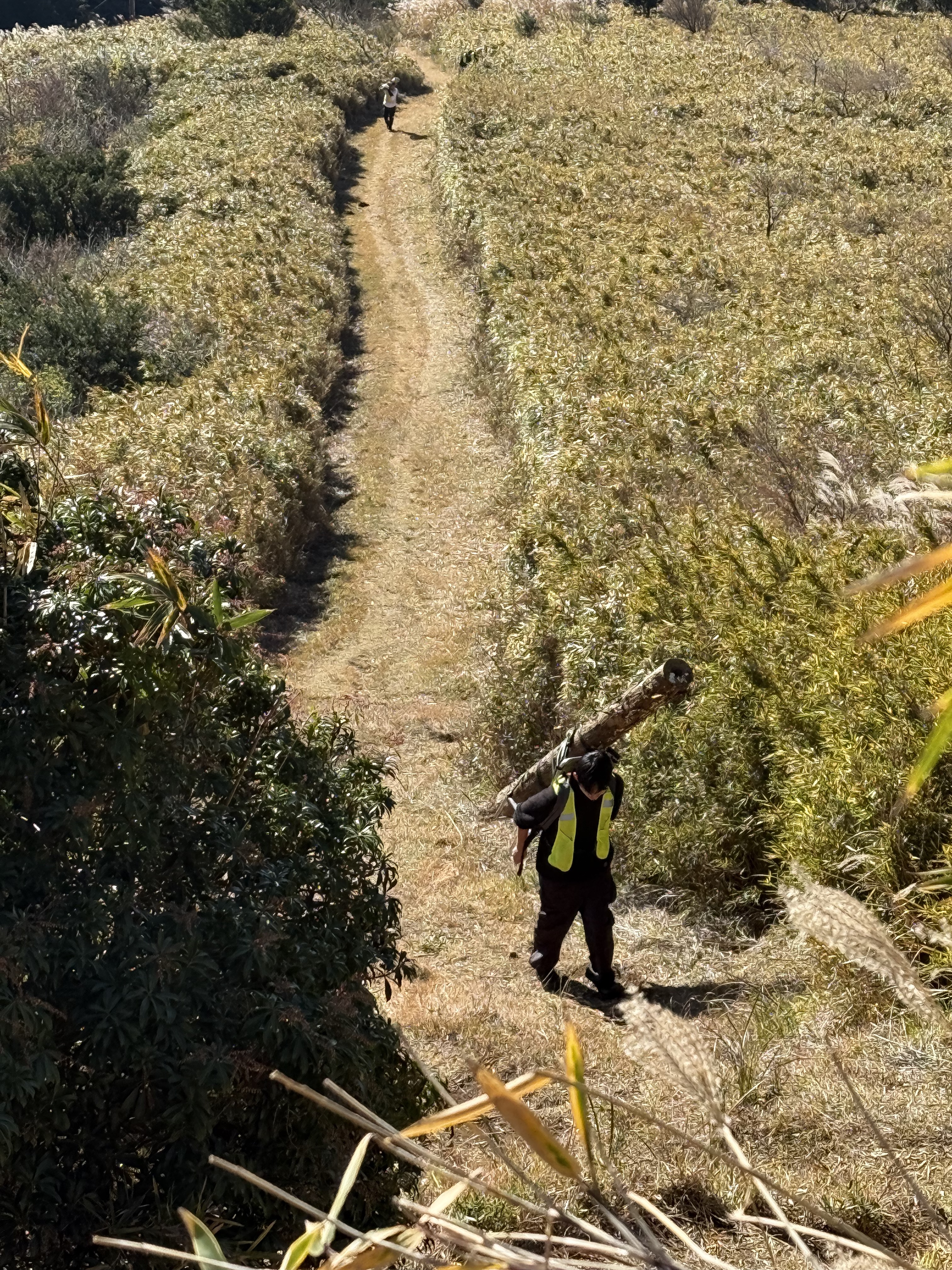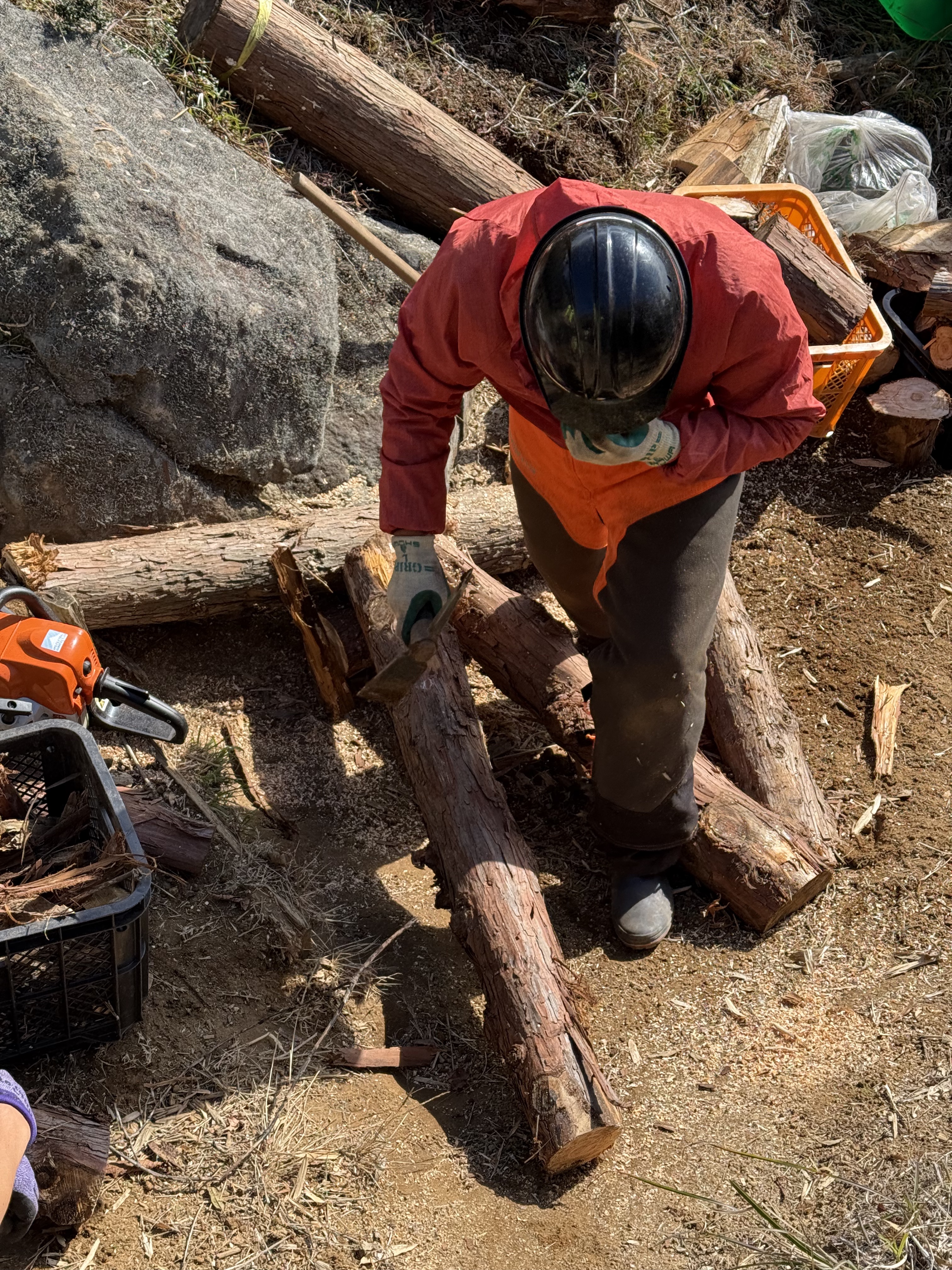 間伐した丸太を森から運び出し、斧で割り、ナタで杭に加工する。単純に見える作業でも、不安定な地形の中で木材を扱うには、かなりの体力と安全への配慮が求められます。20名が1日かけて整備できたのは、わずか500m分の杭。登山道の維持がいかに手間と人手を要する営みかを、実感を伴って理解することができました。