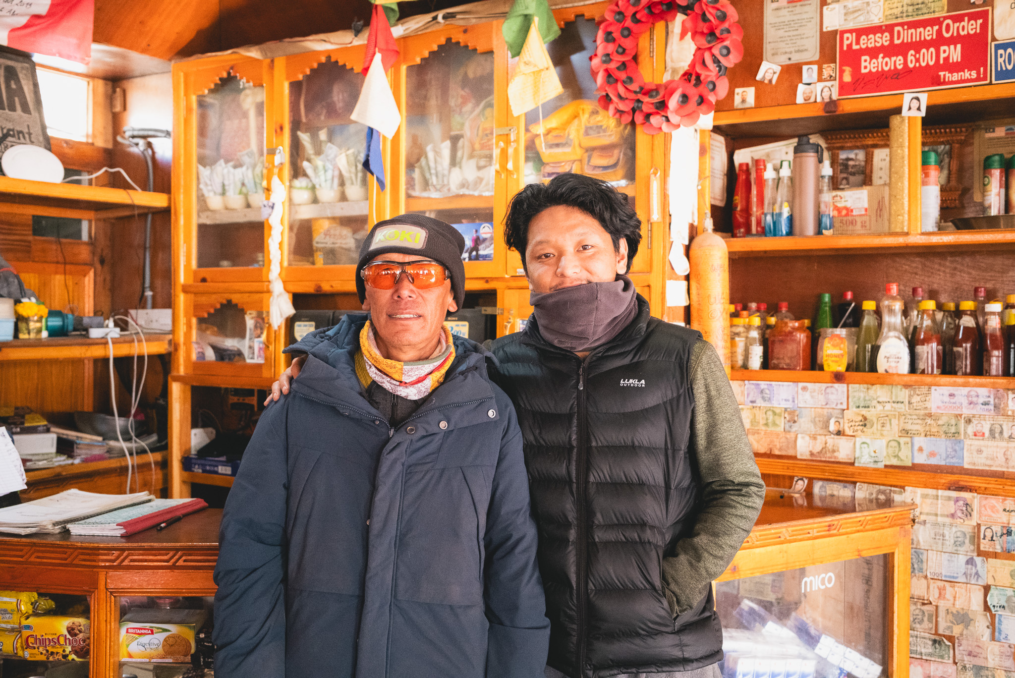 エベレスト街道最後の村として知られるゴラクシェプ。エベレスト登山を契機に生まれたこの小さな村には、わずか数軒のロッジが立ち並ぶのみです。この地で25年間にわたりロッジ『Buddha Lodge』を営んできたパーマ・シェルパさんと、息子のダワ・テンジン・シェルパさんです。