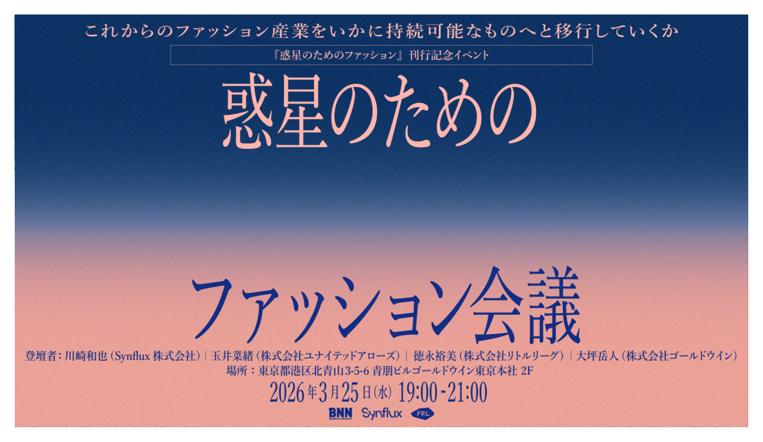 BNNより刊行された書籍『惑星のためのファッション』の出版を記念し、Goldwin Field Research Lab.とSynfluxのコラボレーションによるイベント「惑星のためのファッション会議」を開催いたします。
